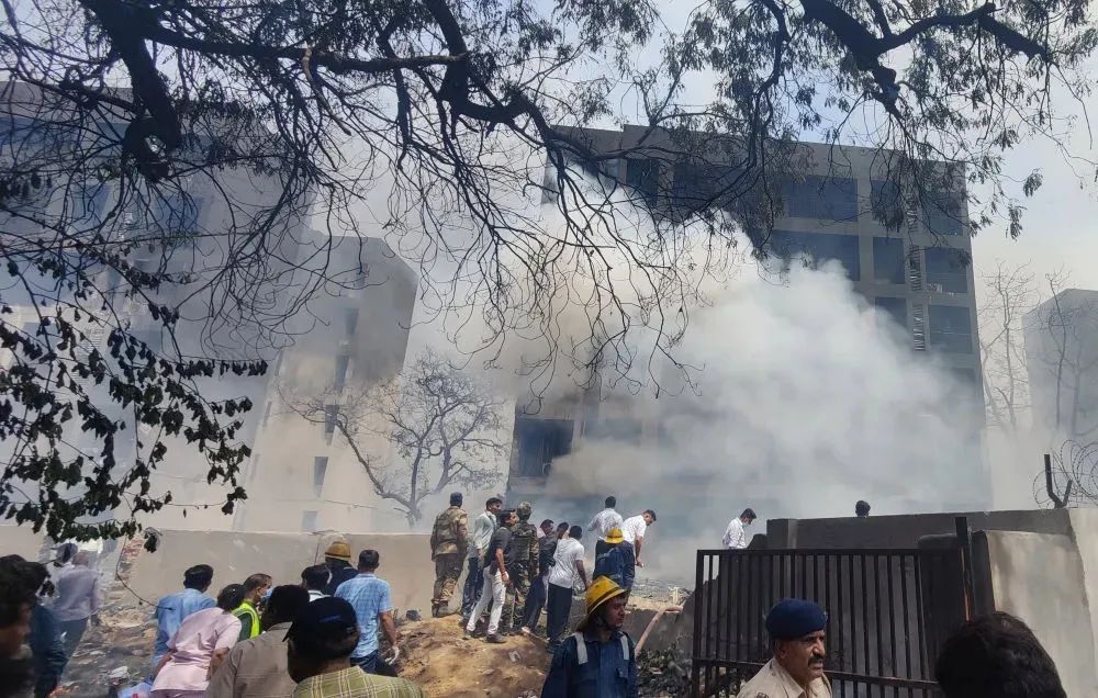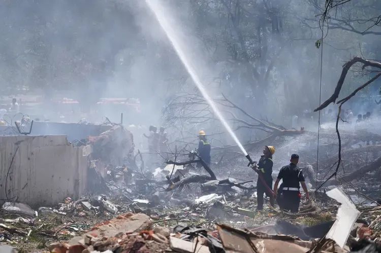 6月12日,在印度古吉拉特邦艾哈迈达巴德,人们在客机失事现场进行救援。图/新华社
